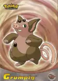 Grumpig | Rarely seen with a smile on its face, this Psychic type Pokémon can always be identified thanks to its curly tail. Unlike its earlier version, though, the Grumpig rarely bounces on its tail. |