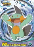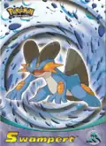 Swampert | With its large fins, Swampert is able to tell if storms are approaching. If it senses one, this Water/Ground Pokémon will pile stones up around itself for protection. |