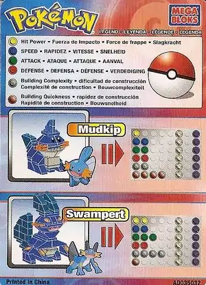 Pokémon Build 'n Battle was a series of construction toys manufactured by Mega Bloks in the early 2000s. Each building set contained enough blocks to build one of two Pokémon from the same evolutionary family (but not both at the same time), a strength chart, scoring pieces, and two die.