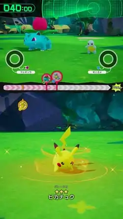 The screen is divided into two during battles, separated by the Attack Gauge (Japanese: こうげきゲージ). The opposing Pokémon appear at the top and the player's Pokémon are present on the bottom. At the start of a battle, icons of the participating Pokémon are placed on the attack gauge at points based on their Grade. Pokémon with comparatively lower Grades are generally placed further along the gauge as to give them a head start. The opposing Pokémon are identified in red, while the player's Pokémon are identified in blue and orange, correlating with the slots and buttons on the console.