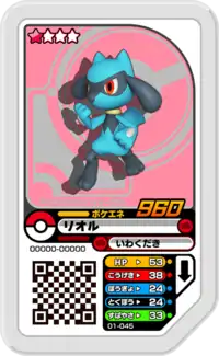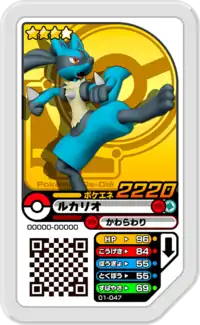 Pokémon in Pokémon Ga-Olé are divided into Grades, as indicated by a star rating system on disks. Grade 1 Pokémon have 1 red-colored star, Grade 2 Pokémon have 2 blue-colored stars, Grade 3 Pokémon have 3 yellow-colored stars, Grade 4 Pokémon have 4 purple-colored stars, and Grade 5 Pokémon have 5 multi-colored stars. Some Pokémon may also have hollow stars as part of their Grade, indicating they have the potential to become stronger either by evolving or by increasing their Grade. The Lucario line from the first set is a good example of this: Riolu is a Grade 1 Pokémon with a maximum potential Grade of 4, and can evolve into a Grade 2 Lucario. A player can then increase Lucario's Grade to 3, and again to 4 with the further ability to Mega Evolve into Mega Lucario.