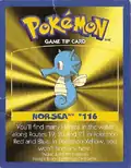 Horsea | You'll find many Horsea in the water along routes 19, 20, and 21 in Pokémon Red and Blue. In Pokémon Yellow, you won't find any here. | |