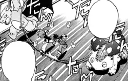 Pokémon Jump appeared as part of a training method designed by Ultima in order to teach Red and Blue the ultimate moves: Frenzy Plant and Blast Burn, respectively. It was their first of three challenges, taking place in what was referred to as The Path of Jumping (The Path of Skipping in the Chuang Yi translation). During the training, Blue had his Charizard grab Saur's vine and run with it while Red and Blue had to jump rope over it without falling. The task was made harder with the floor sliding backward.
