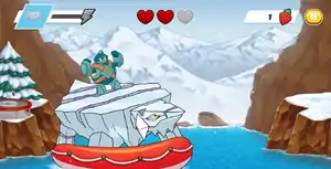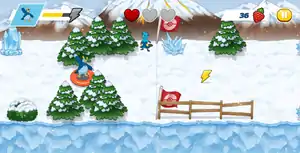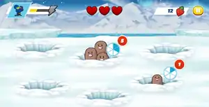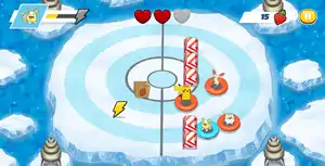 The player would lose a life by being knocked out of the arena or by being struck by ice obstacles. The player could collect heart icons to regain lives. Once the player lost all three lives, the game ended.