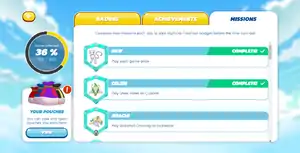 The main menu consisted of four sections, and access to the Games area. Trainer Zone allowed players to see their statistics, including how many Pokémon they have collected, and how long they have played each game. Badges served as a Pokédex to show off Pokémon Badges collected, Achievements, and Missions. Rewards allowed the player to spin the wheel daily and earn rewards. Team Races was a daily event where each team competed to collect the most Razz Berries from playing games to win Badge Pouches. Players could open Badge Pouches by completing certain achievements and tasks. Badge Pouches awarded an assortment of Pokémon Badges which were added to the Badge collection.
