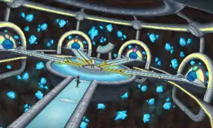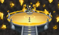 The Champion's chamber is located at the topmost part of the league, surrounded by transparent crystal-like windows, which shows the scenery of the sky and land of Alola clearly. The chamber differs from the others slightly. It has two circular platforms, with the first leading up to the other via a flight of stairs. The second platform is empty except for a throne-like seat.