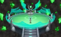 Kahili's chamber can be accessed through the rightmost path of the central chamber. In Kahili's chamber, she greets the player and introduces herself, noting her own history with the island challenge and how she was invited to join the Elite Four. Two green wings made of light emerge from the pedestal behind Kahili after the player enters to close off the arena.