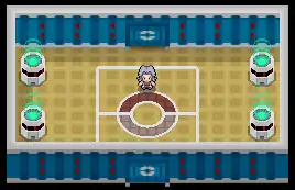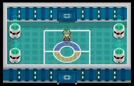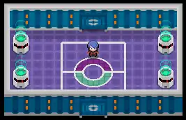 The Hall of Fame is a dark room with a machine resembling a Pokémon Center healing machine, preceded by a vestibule lined with green lights and statues. In it, Cynthia and Professor Rowan congratulate the player on their entrance to the Hall of Fame.