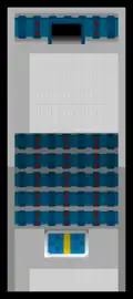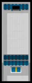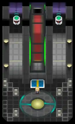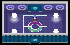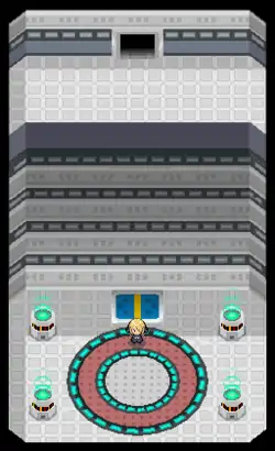 Preceding each Elite Four member's room is a blue and white hallway separated into two distinct parts by a small lift and lined with yellow and red lights. The first hallway leading to Aaron's room has a longer lift than the others, and the hallway to the Champion's room features a longer hallway after the lift.