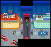 The lobby of the Pokémon League consists of a large, combined Pokémon Center and Poké Mart on either side of the room. In between them is a gateway to the Elite Four, blocked by a guard who will grant access when the player has earned all eight Sinnoh League Badges. The guard is a male Ace Trainer. Like in other Pokémon Centers throughout Sinnoh, the lobby of the Pokémon League building grants the player access to the Wireless Club and a basement where they can access Nintendo Wi-Fi Connection. In Pokémon Diamond and Pearl and Brilliant Diamond and Shining Pearl, the lobby design scheme resembles a large Pokémon Center. In Pokémon Platinum, the lobby has been upgraded to have its scheme being changed to a mainly black one and the escalator to the Wi-Fi Plaza being moved nearer the one to the Wireless Club.