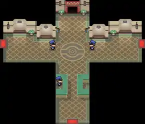The Pokémon League Front Gate serves as the Boulder Badge checkpoint due to the Badge checkpoints being individually distributed by eight guards throughout Route 23. It also works as a connector between Routes 22 and 23. Unlike its Generation II and IV incarnations, it is not a four-way intersection.