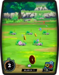 The core gameplay of Pokémon Mezastar takes place on an island with multiple environments connected by railway. At the center of this island is a small settlement that serves as the main hub. Upon inserting ¥100, players can view the available game modes that appear on the wall of the settlement's central tower. These include: Get in Battle! (Japanese: バトルでゲット!) and Get Now! (Japanese: いますぐゲット!). Get in Battle! is the main game mode where players can battle and catch numerous Pokémon over a minimum of three turns; Get Now! mode is a mini-game where players throw Quick Balls at patches of grass to catch random Pokémon.