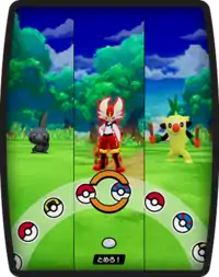 During the player's Pokémon attack animation, the player will be prompted to press the "1" and "2" buttons as fast as possible in effort to increase their attack power further. Segments on the displays encircling these buttons light up and change color as the player presses them, going from red to blue, then to yellow, then to purple, and finally rainbow once the maximum bonus is attained.