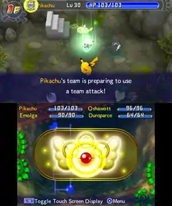 This is a new type of special attack accessed after the Team Badge is obtained. The player has to build this up in dungeons, using moves and defeating wild Pokémon. Once it's built up, the team attack logo will be displayed on the touch screen when L is pressed. It emits a green light and is significantly stronger than regular moves, attacking all enemies in the room and restoring HP, increasing accuracy, etc.