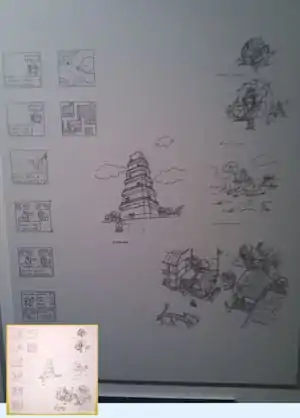 During a gaming exhibition called Game On, early concept art of Pokémon Red and Green by Ken Sugimori was featured, along with pre-release material from Pokémon Ruby and Sapphire. The concept art depicts rough versions of various concepts that made it into the final releases of the Generation I games. They seem to include various battles, the Safari Zone, Red riding on a Lapras, a Blastoise, Celadon City, Silph Co., and a town with a fountain which could have been reworked into Celadon City. Some other Pokémon are identifiable in a raw or semi-normal form, such as Gastly, and others are prototypical of an entire class of Pokémon, such as a basic Dragon-type.