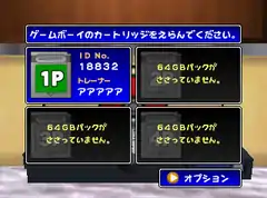 All modes except Battle require a Game Boy game saved at a Pokémon Center and connected via Transfer Pak.[2] If a Game Boy game is connected but not saved at a Pokémon Center, the game displays an error message.