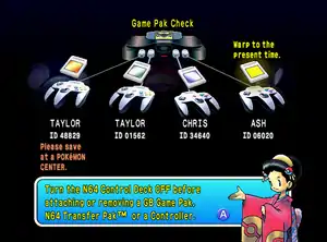 The player may use the Transfer Pak to connect this game with all Generation I and II core series games, depending on their language.