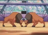 The Tauros-exclusive Rock and Tumble One-on-One Tauros Competition is another event that is part of the same festival as the Pokémon Swap Meet. Tauros engage in tough matches of strength, only using their horns to charge and hold off an opponent. Once a Tauros is tossed to the ground, the round ends. Anyone with a Tauros can enter the event at any time, where the last Trainer standing will be the victor. Ash was a late entrant with his own Tauros, and won the competition after defeating Fernando, who had accumulated a five match streak.