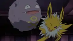Unbeknownst by Ash and his friends, Team Rocket had also been hiding in the tower, seeking for a chance to steal Pikachu. Their plans were foiled, however, due to breaking floors and the pranks of the Ghost Pokémon. Ash even mistook their noises in the basement for the Ghost Pokémon, and had his Pikachu and Charmander attack them, eventually even throwing a Poké Ball at Jessie's face. At the end of the episode, the Team Rocket trio was seen tied up in Gastly, Haunter, and Gengar's carousel, forcing them to stay with the Ghost Pokémon for a while.
