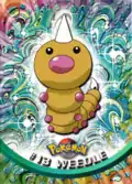 Weedle | Often found in forests, eating leaves, Weedle have sharp, venomous stingers on their heads. In "Challenge of the Samurai," Dexter the Pokédex recalls encountering this shy bug Pokémon meeting up with Ash and Pikachu. As Ash traveled through the forest searching for new Pokémon, he encountered a timid Weedle. The Weedle, in a flurry of fright, climbed high up into the trees to escape. First appearance: Episode 4—"Challenge of the Samurai" |