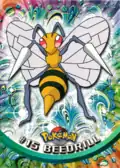 Beedrill | This Pokémon is the final stage of evolution for Weedle. Beedrill fly at incredibly high speeds and they attack using the large venomous stingers on their forelegs and tails. The troublesome Beedrill are known for their quick attacks and violent tendencies. They traditionally gather in large swarms. A thorn in the side of all creatures, these mischievous Pokémon attack with fury and speed, usually without a moment's notice. In "Challenge of the Samurai," a Beedrill entourage kidnaps Ash's Metapod and brings it back to their nest of sleeping Kakuna. Ash and company rescue Metapod, who then throws itself in front of Ash, to save him from a deadly Beedrill stinger attack. First appearance: Episode 4—"Challenge of the Samurai" |