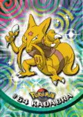 Kadabra | Kadabra is the second evolutionary stage for Abra. This Pokémon can emit special alpha waves from its body that induces headaches. In "Haunter vs. Kadabra," Ash uses his newly acquired Haunter, the ghost Pokémon, to defeat Sabrina and her super-powered Kadabra. First appearance: Episode 24—"Haunter vs. Kadabra" |
