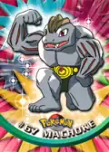 Machoke | Machoke is the second evolutionary stage of Machop. Machoke's muscular body is so powerful that it must wear a power saver belt to regulate its motions. Machoke likes body-building even more than Machop, but its vanity can get in the way of its combat training. First appearance: Ash has not yet encountered a Machoke |
