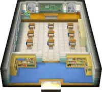Besides the classrooms, the school has a large Poké Ball deposit room, meant to store the many rental Pokémon available at the academy, and several outdoor battlefields for its students to practice on.