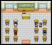 Inside are five students and a teacher, who will give out the Quick Claw. Talking to the students also reveals helpful information for new players. Behind the teacher is the blackboard with the list of status conditions (Poison, Burn, Freeze, Paralysis, and Sleep) that may affect Pokémon in a battle.