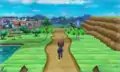 A pre-release screenshot of Route 3 depicts the route with a different camera angle, a different trainer, and lacking the big tree on the left side near the lake.
