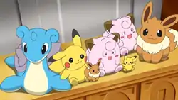 Pokémon dolls of Lapras, Pikachu, Clefairy, and Eevee appeared in Lillie's Egg-xhilarating Challenge!, decorating Lillie's room.