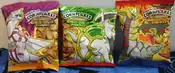 Pokémon Cornflakes were a packaged cereal product sold at the Japanese Pokémon Center. The 2009 version was used to promote the new Diamond and Pearl movies.[1] The three packs were released in 2009, each featured a different legendary Pokémon of Sinnoh. The three Pokémon featured were Palkia, Arceus, and Giratina, with the packs colored magenta, green, and orange, respectively. The flavor presented differed by the year the packages were released, with the 2009 edition having a "Mild Chocolate" flavoring and the 2008 edition being "Sugar" flavored.[2]