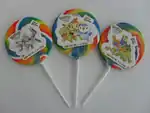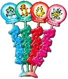 Pokémon Rainbow Lollipops were made by Bartons Candy in 2007.[41] They were large, colorful lollipops that included a sticker, either Palkia and Dialga, the Sinnoh starters, or their first evolutions.