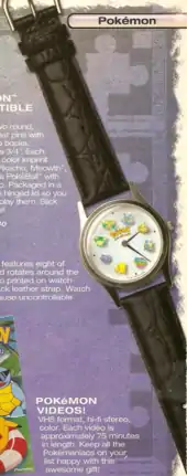 A Pokémon wristwatch was available through the Nintendo Power Power Supplies Catalog from Summer 2000. The watch had a leather strap and featured images of Poliwrath, Meowth, Blastoise, Venusaur, Pikachu, Gengar, Snorlax, and Charizard around the second hand dial.