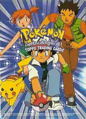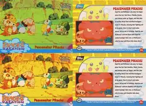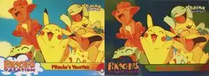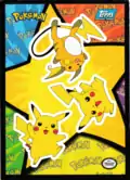 Pokémon the First Movie Trading Cards was a set of Pokémon-themed trading cards manufactured by Topps in 1999. There were 72 cards in total: 41 cards featuring scenes from Mewtwo Strikes Back, 18 cards featuring scenes from Pikachu's Vacation, 12 evolution cards, and a checklist. Each of these 72 cards also had two foil card versions (silver and rainbow). In addition, there were 30 bonus "chase cards" not included on the checklist, including 12 die-cut embossed evolution cards and 18 sticker cards.
