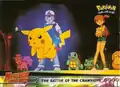 The Battle of the Champions | Pikachu tries to reason with Mewtwo, letting the super-Pokémon know that Ash is its friend, not master. Mewtwo, with a devilish smile, hurls Pikachu across the room into Ash's open arms. Ash challenges Mewtwo to a Pokémon battle. Mewtwo accepts with a smile. Team Rocket watches as clones of a Charizard, Blastoise and Venusaur climb out of their holding tubes and make their way up to their master's side. |