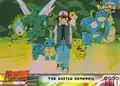 Reunited! | As Ash sits on the conveyor belt of the destroyed and charred remains of the Pokémon Replication System catching his breath, Pikachu is released from its dark prison. When the smoke clears, all of the stolen Pokémon are released from their black Pokéballs. As Ash happily reunites with Squirtle and Bulbasaur, he stands slowly with fire burning in his eyes. |