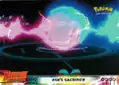 Ash's Sacrifice | The real, passive Pikachu refuses to fight as its clone beats on it, for it knows that fighting doesn't solve any conflict. "Someone's got to take a stand, someone's got to say no and just refuse to fight, just like Pikachu," Ash cries. Mewtwo and Mew aim deadly psychic blasts at each other ready to destroy everything—humans and Pokémon alike. Just as the blasts surge from their fingertips, Ash leaps into the middle of the explosion! |