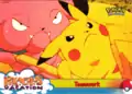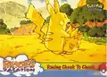 Racing Cheek to Cheek | Squirtle and Bulbasaur are sore losers after the race, so Raichu—just to be mean—starts zapping the ground around Togepi, scaring the baby. Pikachu runs over to shelter Togepi from the little zaps, but gets zapped in the rear end himself! A real electric shock showdown takes place as Pikachu and Raichu, with sparks flying, begin a mad race through the park. |