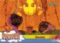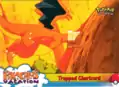 Success | With Cubone's help, Charizard is freed and goes soaring through the air with Psyduck still holding the rope. As the two go careening through the sky, a very sleepy Meowth tries to nap, but is once again disturbed by the excitement. Meowth lights a bomb and prepares to hurl it at the other Pokémon, but out of nowhere, Charizard lands on top of it, and the bomb blows up under Charizard's rear end! |