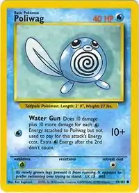 Poliwag (Japanese: ニョロモ Nyoromo) is a Water-type Basic Pokémon card. It was first released as part of the Base Set.