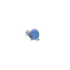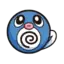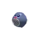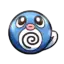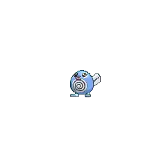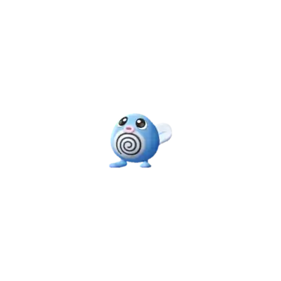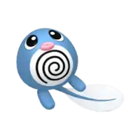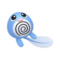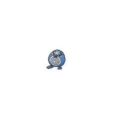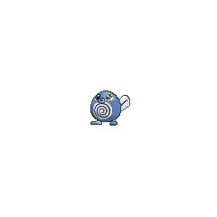 Poliwag is a Pokémon resembling a blue, spherical tadpole. It has large eyes and pink lips that can also act as suction cups for rocks. Its skin is very thin, but flexible and difficult to puncture. There is a black and white swirl on its abdomen, which is actually its internal organs showing through its semitransparent skin. The swirl is clearer following a meal and will have a white tinge if the Pokémon is affected by disease. The direction of the belly spiral differs by area; the equator is thought to have an effect on it.