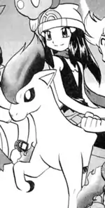 Platinum owns a Ponyta, which serves her as a form of transport. It first appeared in Stagestruck Starly. Although it was a weak battler with nothing but a streak of losses against every Gym Leader he had faced, in Canalave City, he was somehow able to defeat both of Byron's Bronzong and evolve into a Rapidash soon afterwards.