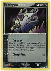 Poochyena (Japanese: ポチエナ Pochiena) is a Darkness-type Basic Pokémon card. It is part of the EX Deoxys expansion.
