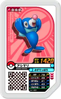 Popplio (Japanese: アシマリ Ashimari) is a Grade 1 Pokémon Ga-Olé disk. It is part of the first Ultra Legend set.