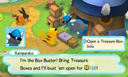 Unlocked after completing the first job request after finishing Desolate Canyon for the first time. It is run by Rampardos, and the shop opens Treasure Boxes the player finds in the various dungeons. It is similar to Xatu Appraisal shops found in previous games. He requests ![]()