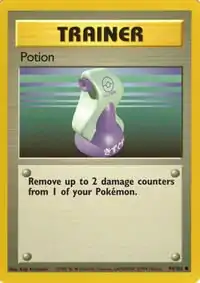 The Potion was introduced as a Trainer card in the Pokémon Trading Card Game during the English Original Series (the Japanese Original Era) in the Base Set expansion with artwork by Keiji Kinebuchi. It was later released as an Item card in the Black & White expansion with new artwork by Ayaka Yoshida, first released in the Japanese Beginning Set. This card has since been released numerous times throughout the course of the TCG.