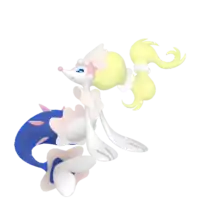 Primarina is a marine Pokémon that resembles a cross between a sea lion and a mermaid. Most of its body is white, but it has a long, fishlike tail. It has a long snout with a round, pink nose, bright blue eyes with long white eyelashes, and long light blue hair trailing off the back of its head. A tiara-like structure rests on its forehead, consisting of a line of pearls with a pink sea star at one corner and a thin, transparent blue fin extending back over its hair. Its hair is contained to a ponytail by two strings of pearls. This ponytail, as shown in the games and anime, becomes temporarily undone when it performs certain moves. On its body are three fins similar to the one on its crown: one that drapes around its shoulders and chest, one around its waist where the fishtail begins, and one near the tip of its tail. It has long front fins with three digits. Primarina's long fishlike tail is bright blue with small pointed, pink fins around its hips. Its tail fins are white, and it is capable of using them as feet to stand up.