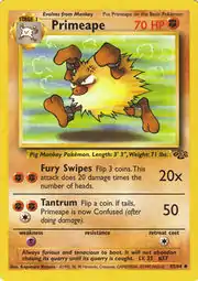 Primeape (Japanese: オコリザル Okorizaru) is a Fighting-type Stage 1 Pokémon card. It was first released as part of the Jungle expansion.