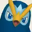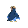 Prinplup is a blue, penguin-like Pokémon. It is mostly dark blue with light blue facial markings, wing tips, and lower body. Its eyes are blue and it has a short yellow beak with a small point above it. Two large, yellow ridges extend from its beak over the back of its head and meet just above the nape of its neck. On its body are four large, white spots that resemble buttons. Instead of arms, it has long, flipper-like wings that are capable of knocking over and snapping trees. It has short legs with yellow, three-toed feet. Prinplup has a high sense of self-pride, which prevents it from forming groups of its own kind. This Pokémon can be found in icy waters, where it hunts for prey.